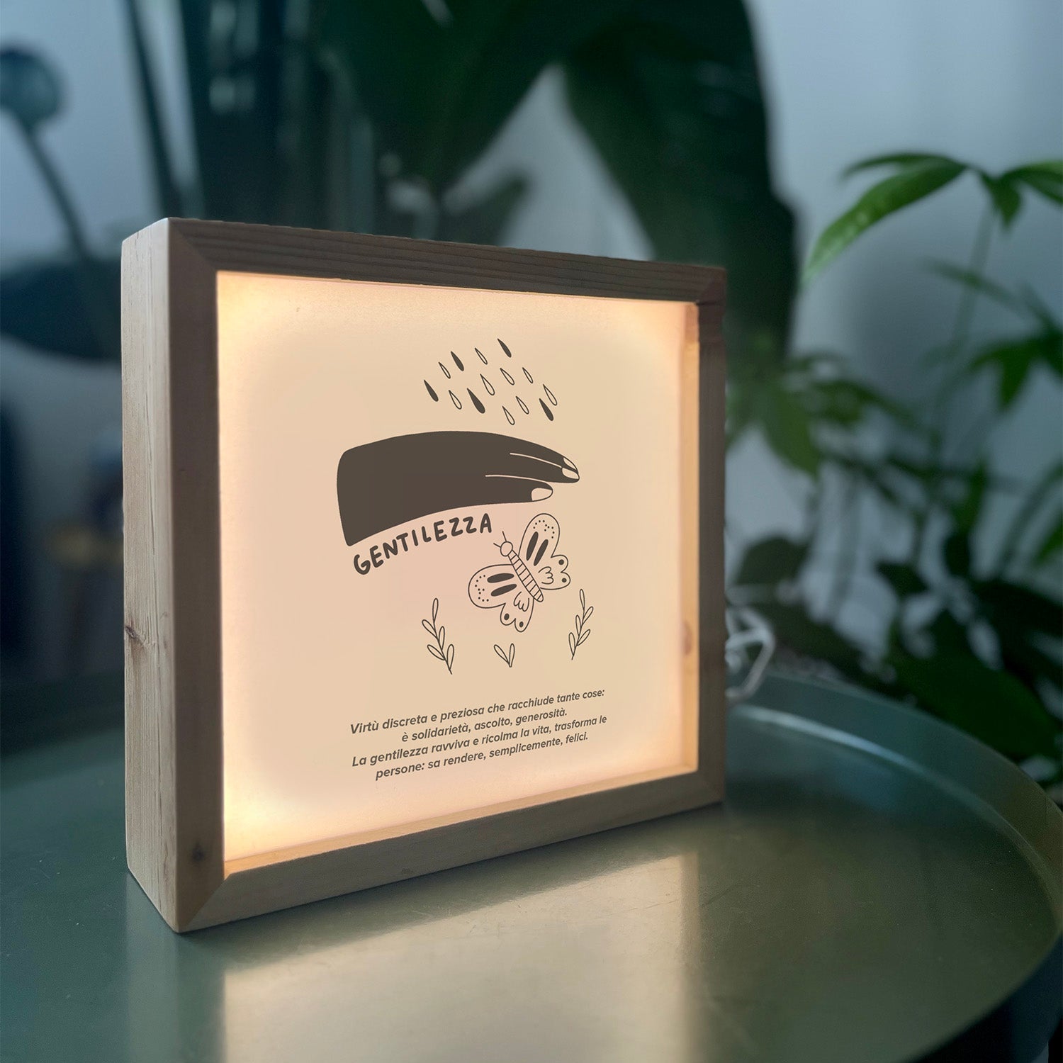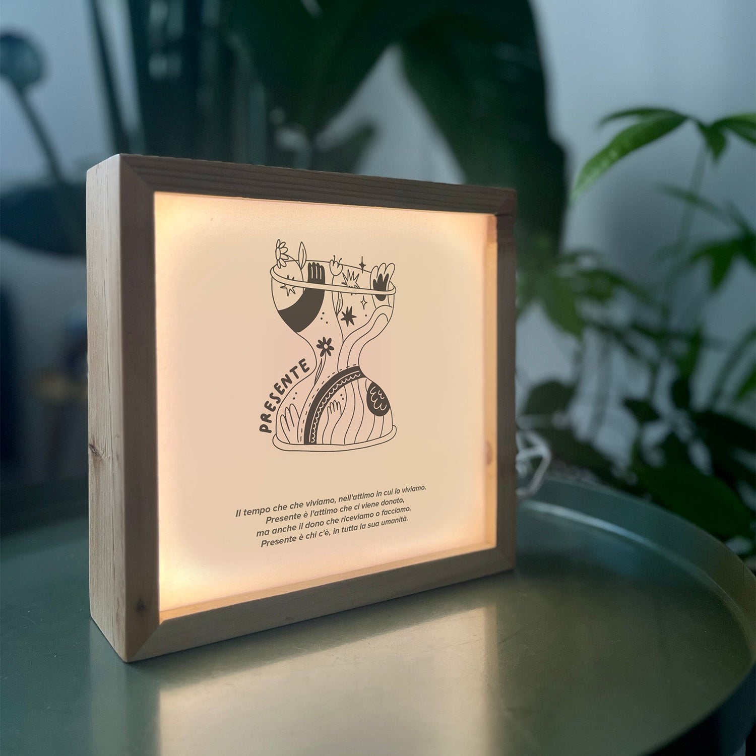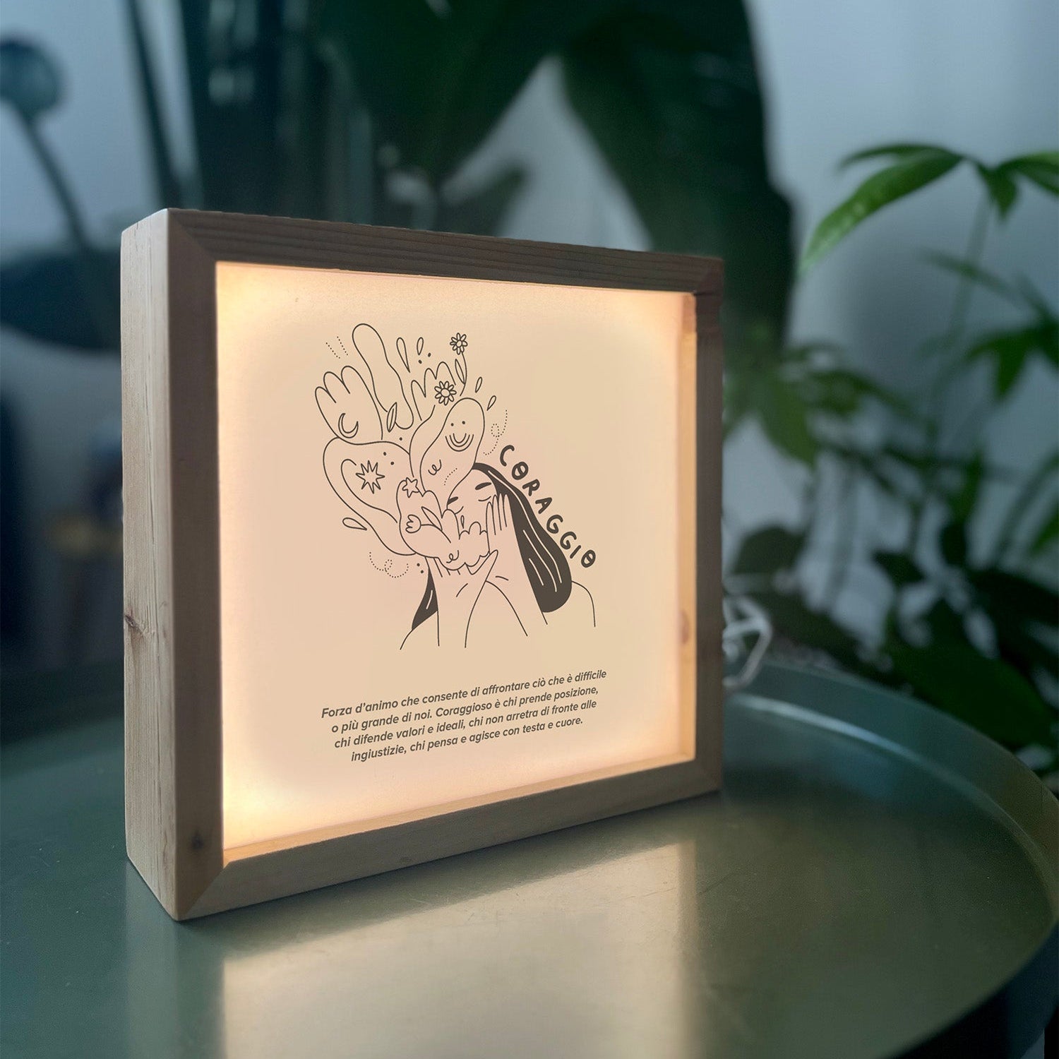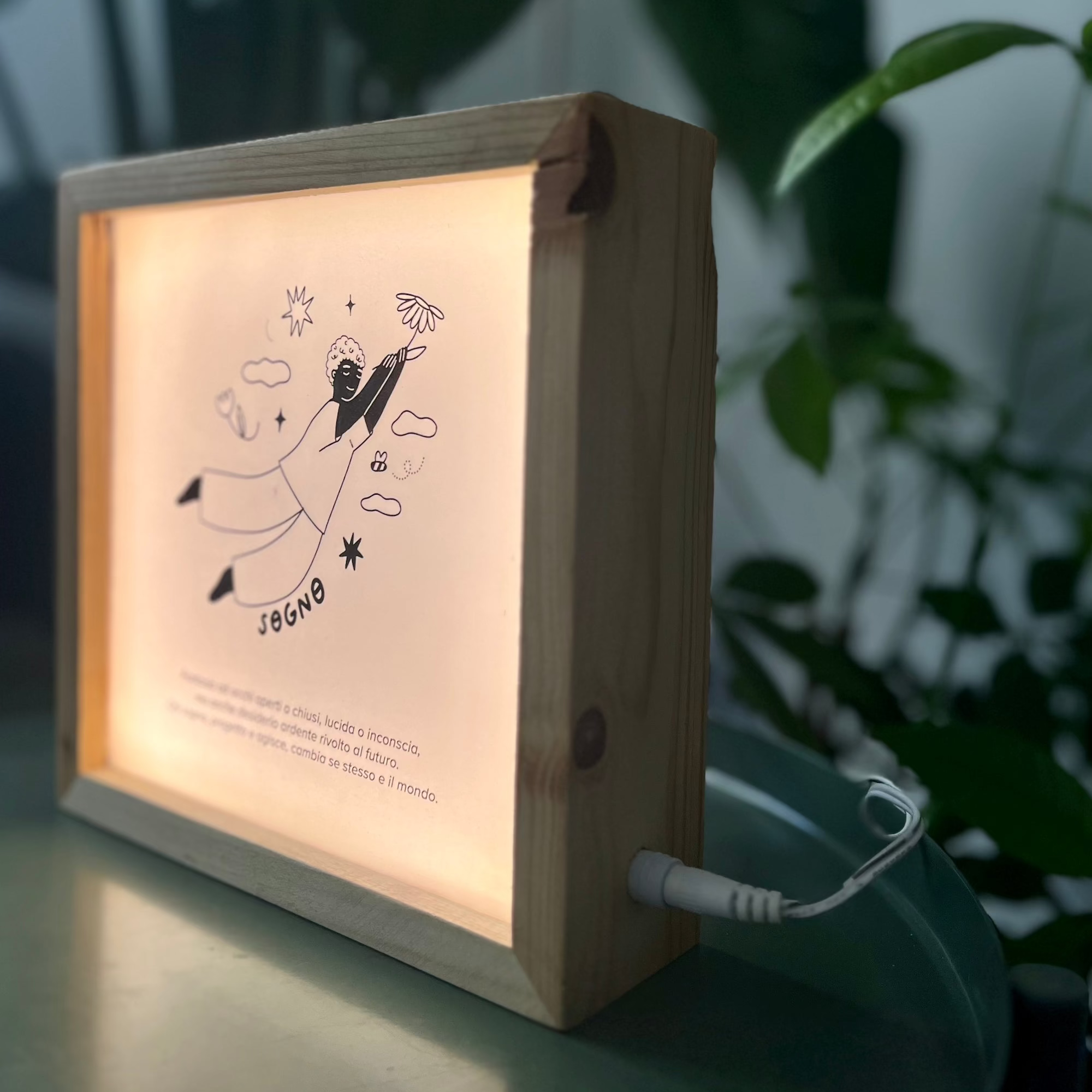 Una cornice per illuminare la casa in modo sostenibile con le illustrazioni, le parole e i messaggi che più ti rappresentano. In assi di pallet recuperate, con strip led interna a basso consumo. Fatta a mano da uno scappato di casa.