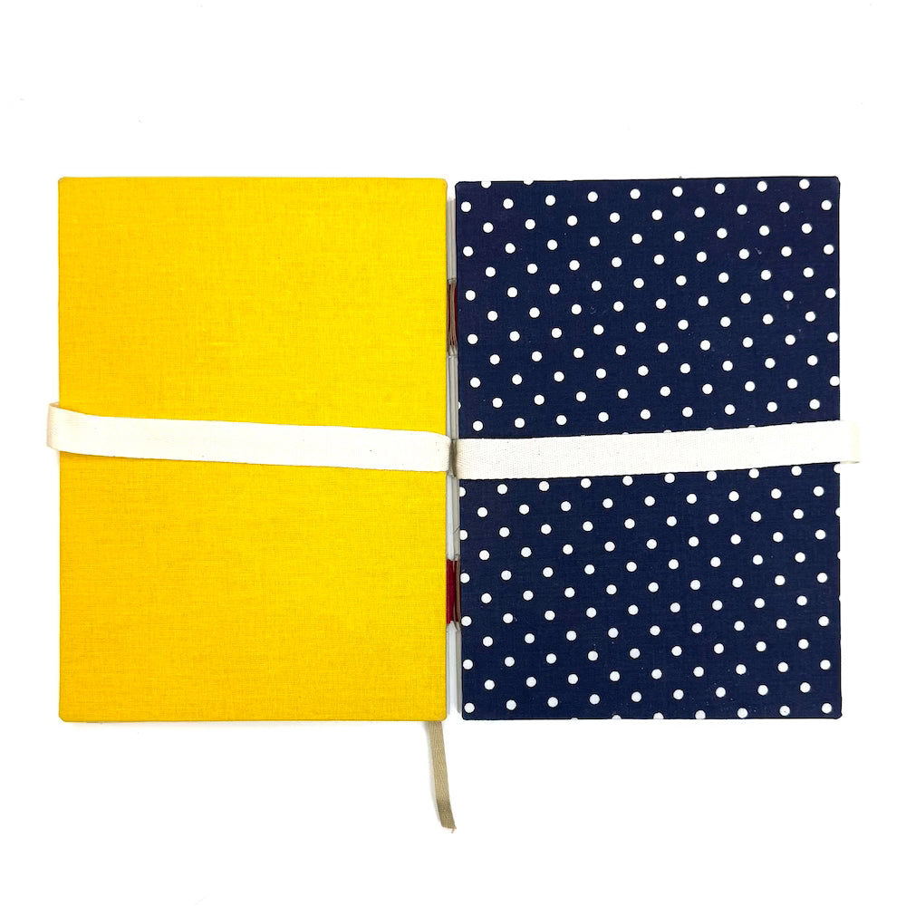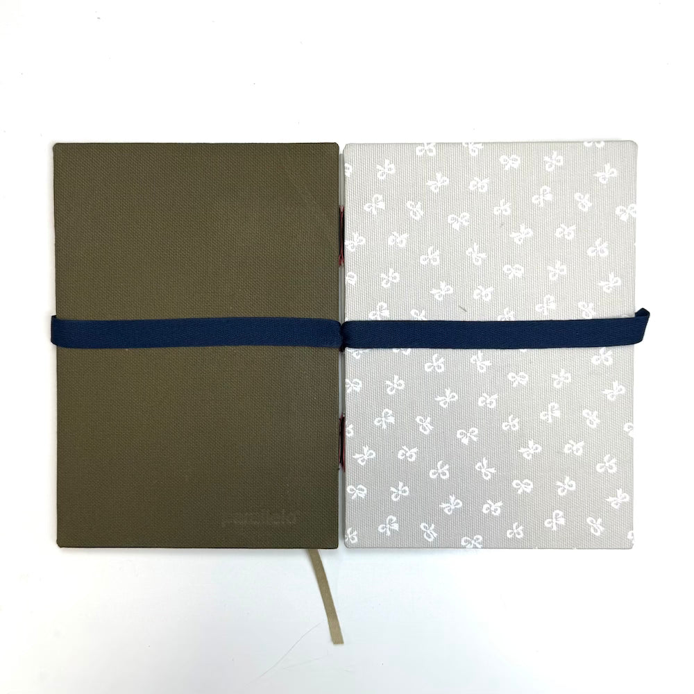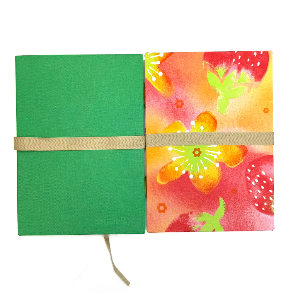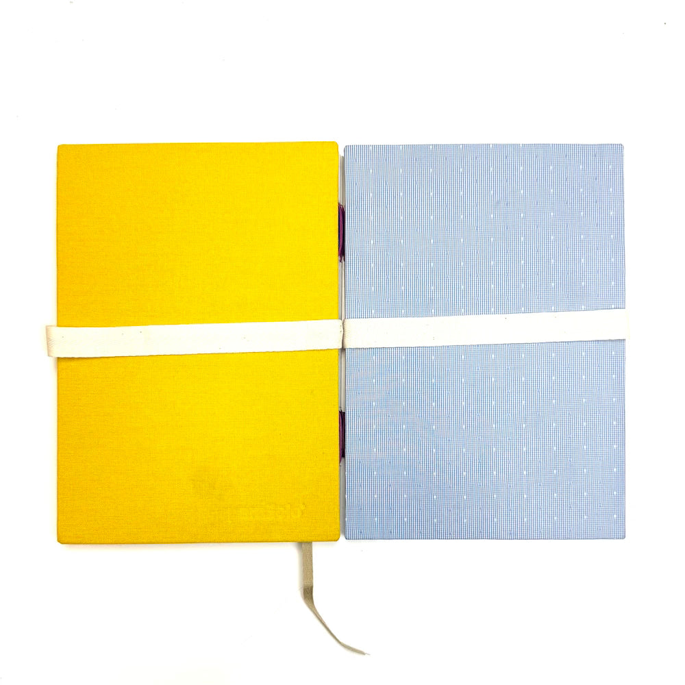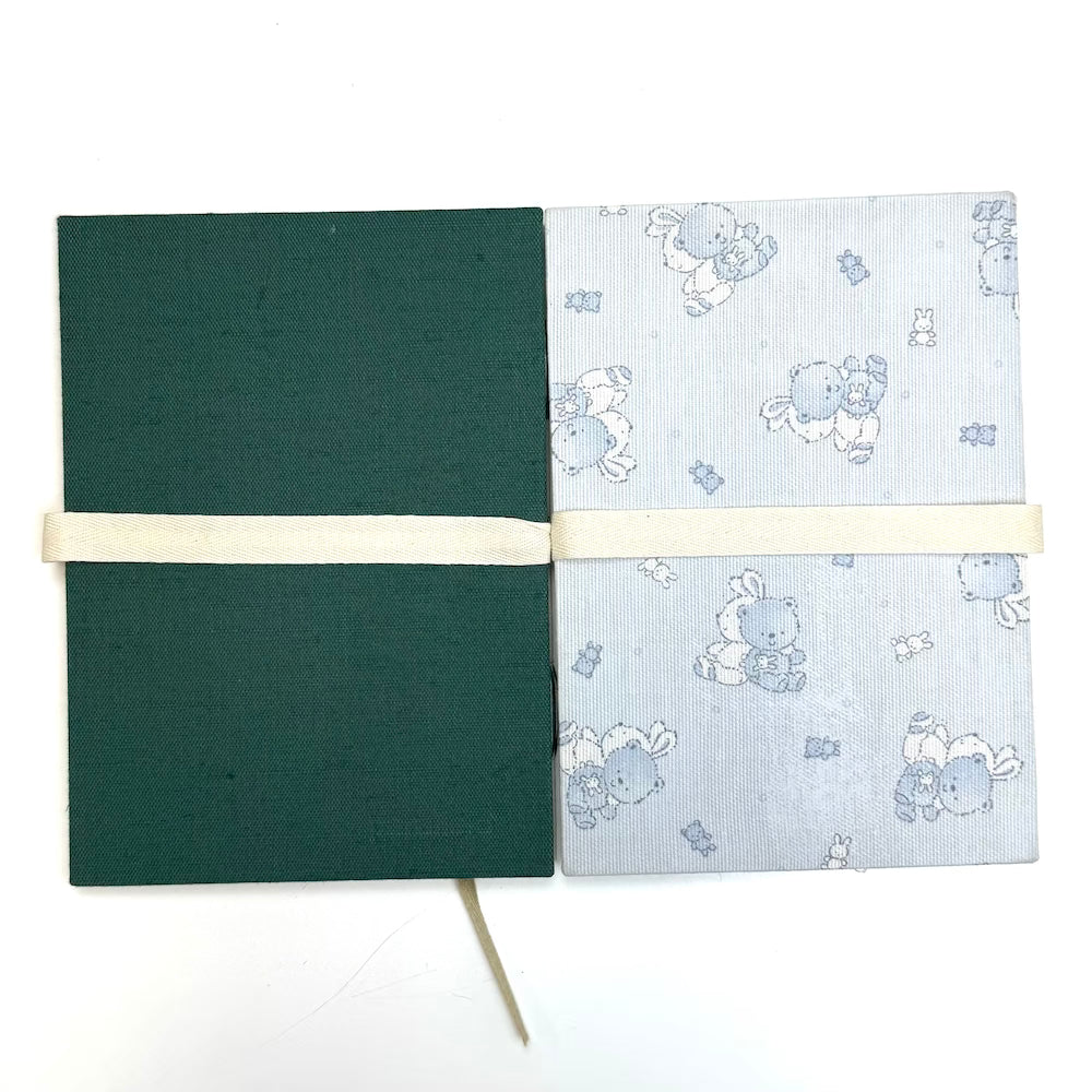 • copertine in cartone rivestite con tessuti di recupero di colori diversi
