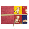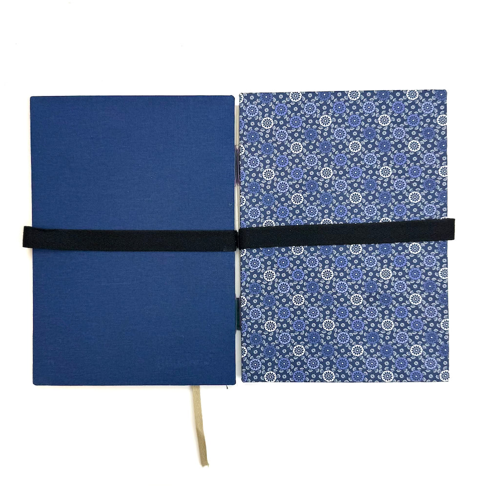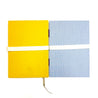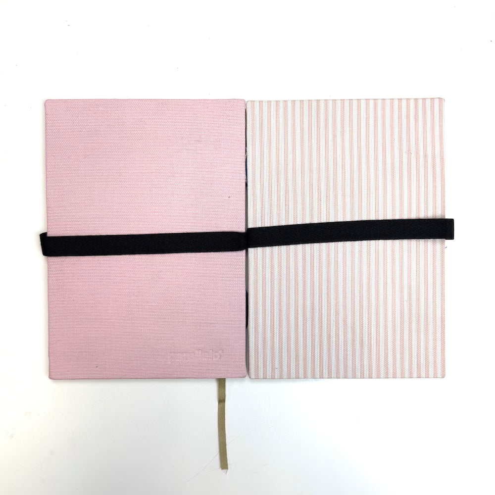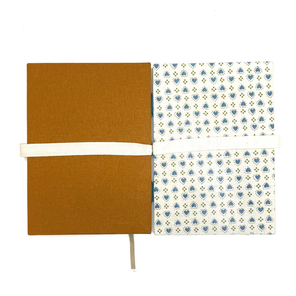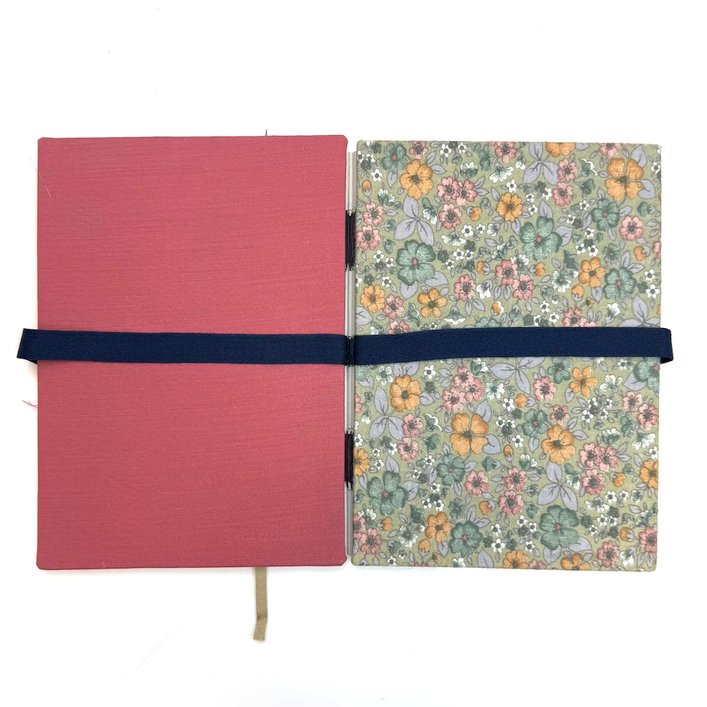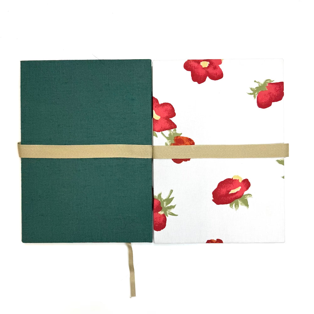 • copertine in cartone rivestite con tessuti di recupero di colori diversi