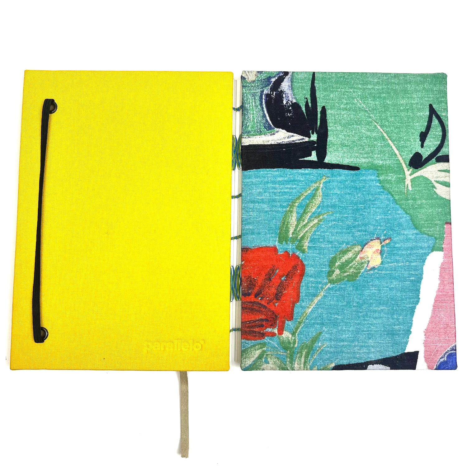 • copertine in cartone rivestite con tessuti di recupero di colori diversi