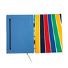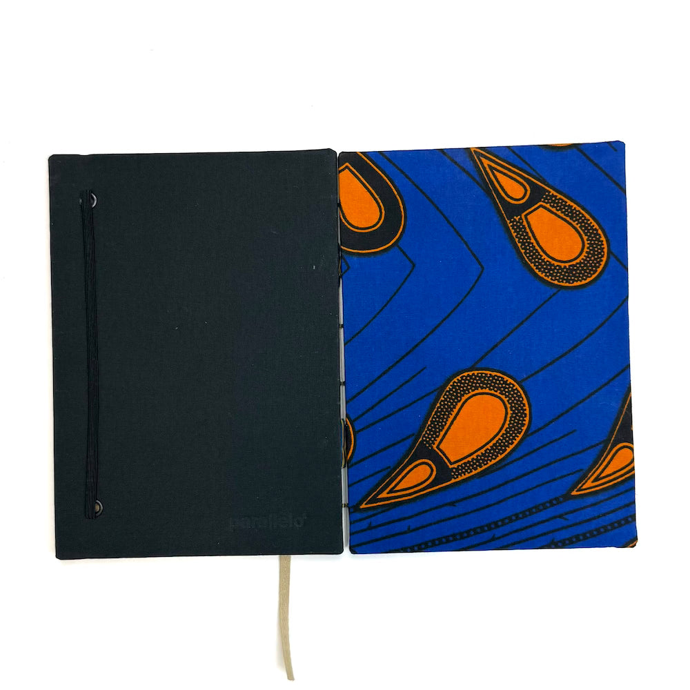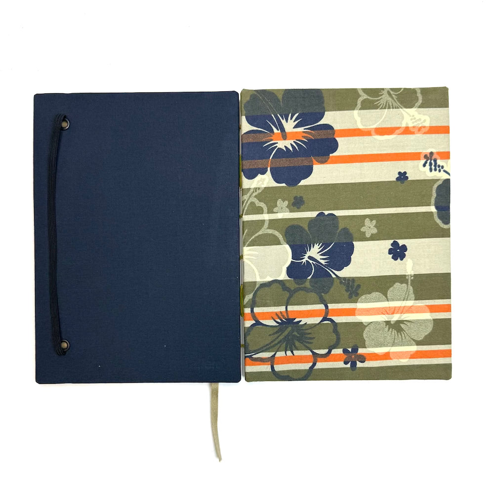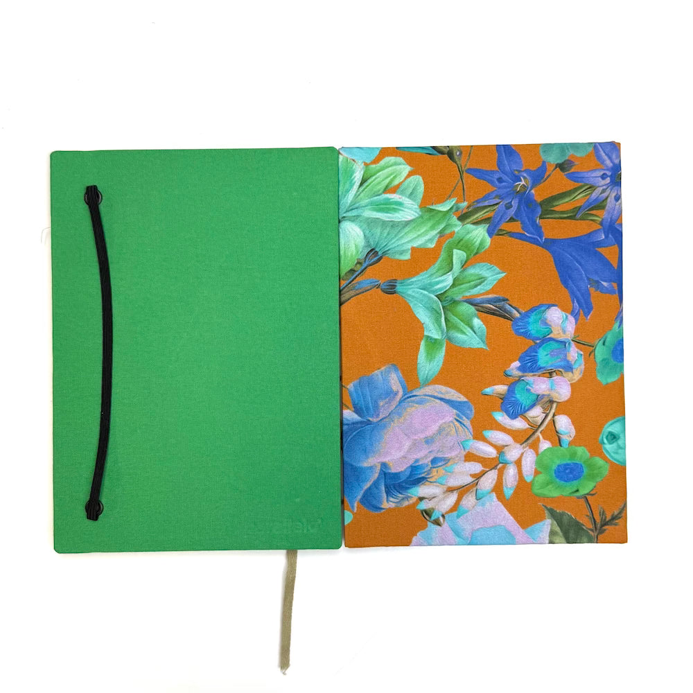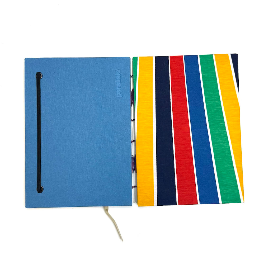 • copertine in cartone rivestite con tessuti di recupero di colori diversi